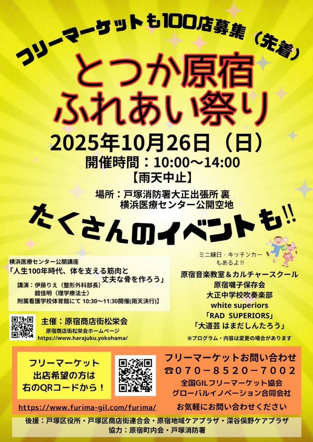 event 2025.10.19 2025年10月26日(日) とつか原宿ふれあい祭り 10/26(日)出演:white superiors/RAD SUPERIORS/Sakura Bloom Superiors&cocco(Harmonize Family) とつか原宿ふれあい祭り 場所:戸塚消防署大正出張所 裏横浜医療センター公開空地ライブ出演時間:11:10〜予定 *弊社物販に関しましては、ライブ終了後、1時間ほどを予定しております。ステージ周辺にてご対応させていただきます。 (*ANJU/YURI/SARA/COCO/miko/sana/nami/sa-raにおきまして、学校行事の都合上、当日お休みとなる可能性も御座います。) Post Share Hatena Pin it 2025年10月25日(土) さがみはらリニアフェスタ2025 前の記事