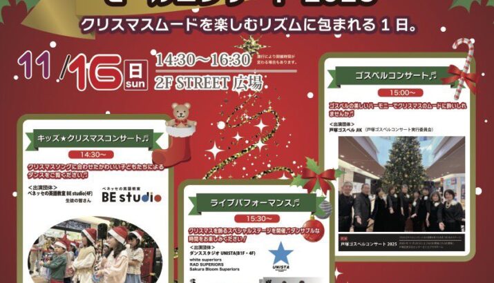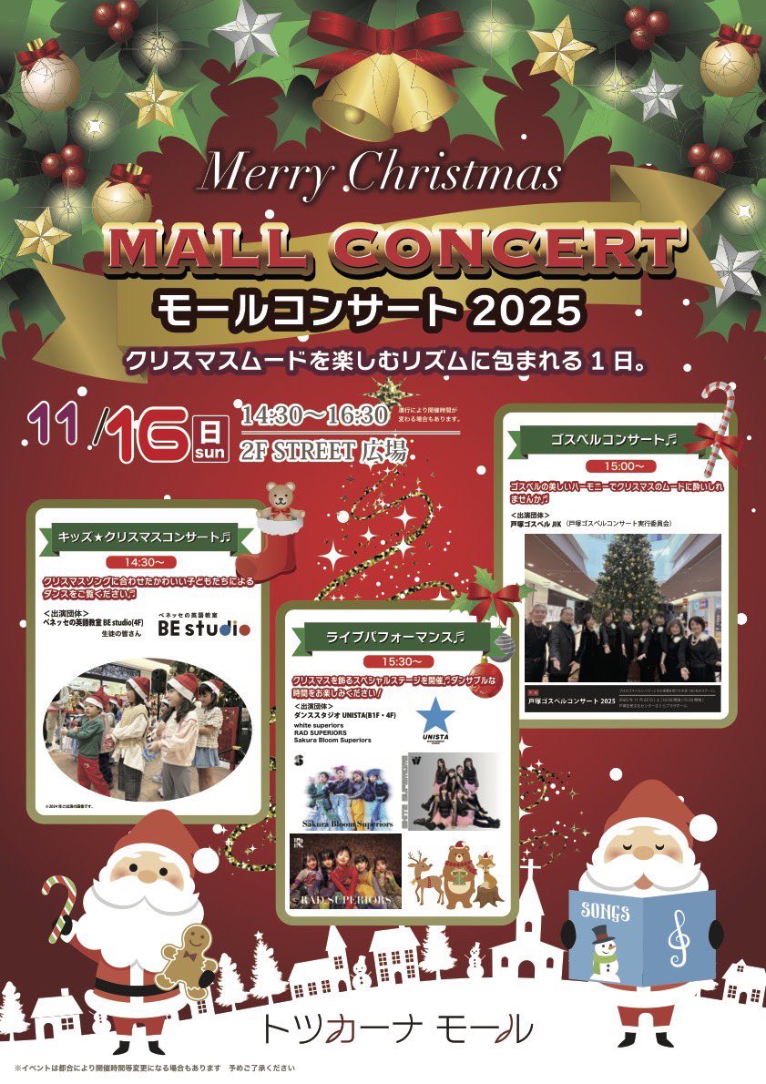 event 2025.11.09 2025年11月9日(日) モールコンサート2025 11/16(日)出演:white superiors/RAD SUPERIORS/Sakura Bloom Superiors&cocco(Harmonize Family) モールコンサート2025 場所:トツカーナモール2F STREET広場ライブ出演時間:15:30〜予定 *弊社メンバーのライブ中の撮影におきましては撮影可能となります。物販に関しましては、ライブ終了後を予定しております。 Post Share Hatena Pin it 2025年11月15日(土)「もーれつ ガラ・ステージvol.65~マジカルバルルーンYesあやの東京ファイナル公演~」 前の記事 2025年11月23日(日) アイ♥ゲキ 次の記事