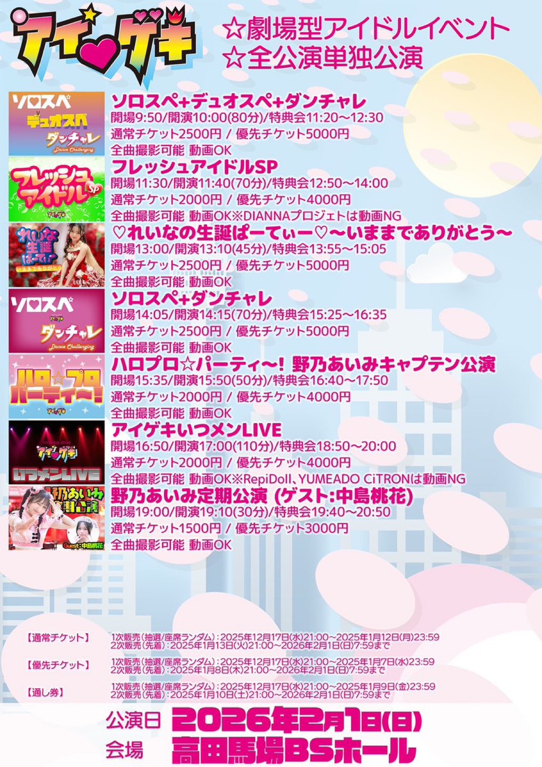 event 2026.01.27 2026年2月1日(日)アイ♥ゲキ 2/1(日)出演:RAD SUPERIORS/Sakura Bloom Superiors アイ♥ゲキ フレッシュアイドルSP :RAD SUPERIORS+Sakura Bloom Superiors ソロスペ+ダンチャレ:ソロスペ:YUI(RAD SUPERIORS)ダンチャレ:ANJU/YURI/SARA/COCO(RAD SUPERIORS) 会場:高田馬場BSホール チケット販売ページlivepocket.jp/e/igeki2026201… Post Share Hatena Pin it 2026年1月31日(土)「もーれつ ガラ・ステージvol.66」 前の記事
