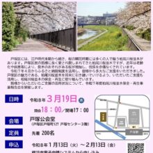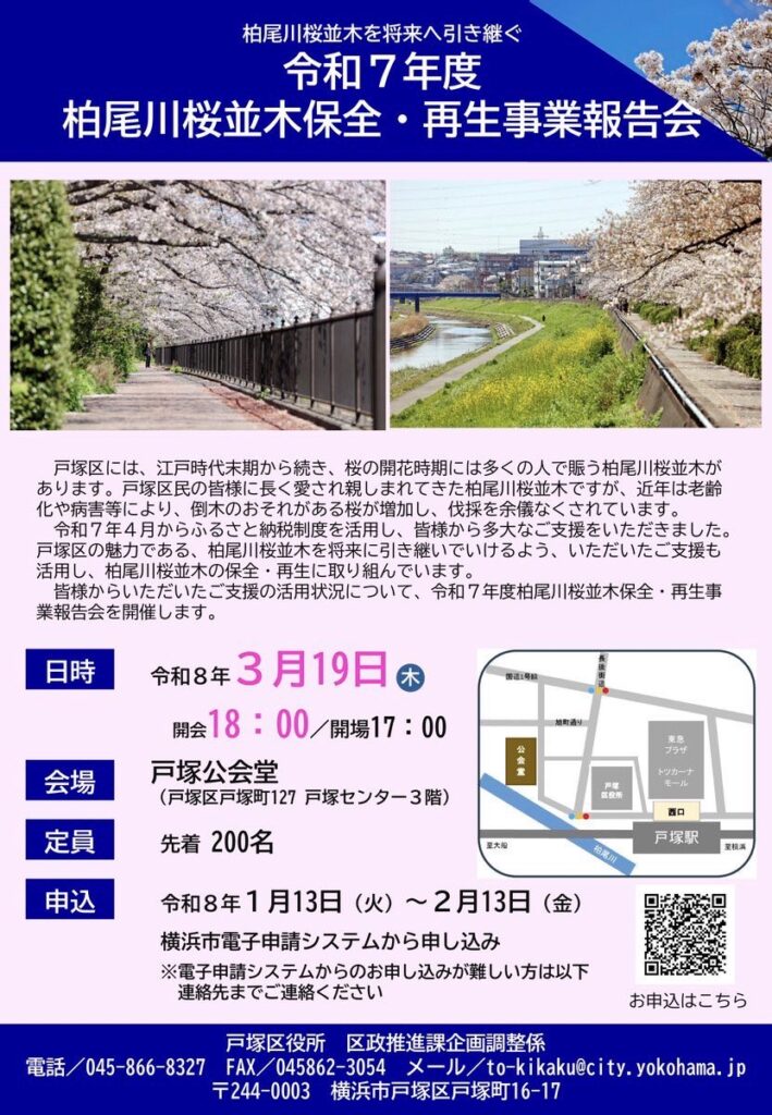 event 2026.03.16 3/19(木)令和7年度 柏尾川桜並木保全・再生事業報告会 3/19(木)出演:Sakura Bloom Superiors 令和7年度 柏尾川桜並木保全・再生事業報告会 会場:戸塚公会堂開場:17:00/開会18:00 ライブ出演:19:00〜予定 *撮影におきましては禁止となります。当イベントにおきましての物販はございませんのでお気をつけください。 Post Share Hatena Pin it 3/15(日)アイ♥ゲキ 2026年初野外ライブ アイゲキ 前の記事 3/22(日)2026年(第43回) かわね桜まつり 走ろう会7 次の記事